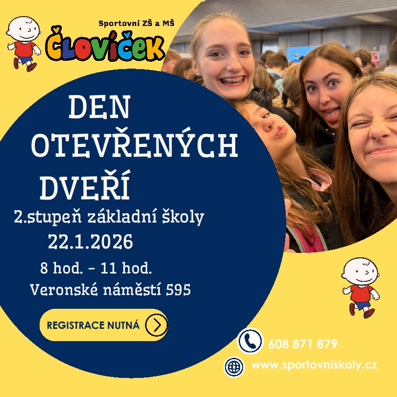 Srdečně Vás zveme na Den otevřených dveří pro 2. stupeň, který se uskuteční 22.1.2026 od 8:00 – 11:00 hod. v prostorách naší školy!